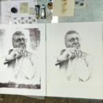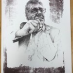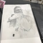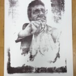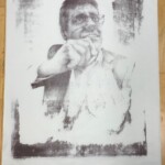 Printing the 165 Drawn image with a range of pulls to achieve an edition of 4 was a challenge as the ink began to settle in the screen. The first print being the darkest and the 4th with less contrast and less ink. However this is good result in terms of previous portraits and reflected the Adrian in a positive light. The drawing with the outstretched hand to the fore worked well and established the portrait developing from bottom with less detail to the head with detail retained. However after initial viewing the foreground hand is perceived as contributing to the expressiveness of the subject’s commitment.