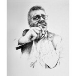 I decide to leave the foreground hand without detailed information. The eyes look out over the other hand, which is drawn in detail. The gesticulation of the foreground hand is described by 8 lines. The intention is to draw attention to the face with hand in front towards the top half of the portrait, while retaining the effect of the lower hand, without it detracting. This encourages the viewer to experience the image develop from the bottom to top.