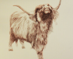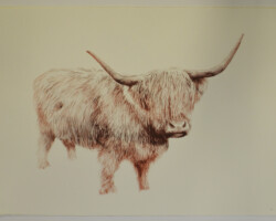 When I spend time in the Scottish Borders I am always drawn to the animals who inhabit the fields across the lowland terrains.  From time to time I am able to get up close and begin drawings. It has been commented that the resultant drawings and prints are ‘portraits’ of the animals personalities.  They certainly feature each animal’s face have a quality that recognises their being. Slide show below of Hirsel cattle(A1 duotone drawn silk screen), twizel horse (A1 drawn silk screen) and Coldstream Salmon (A3 ink jet) all editions of 5.