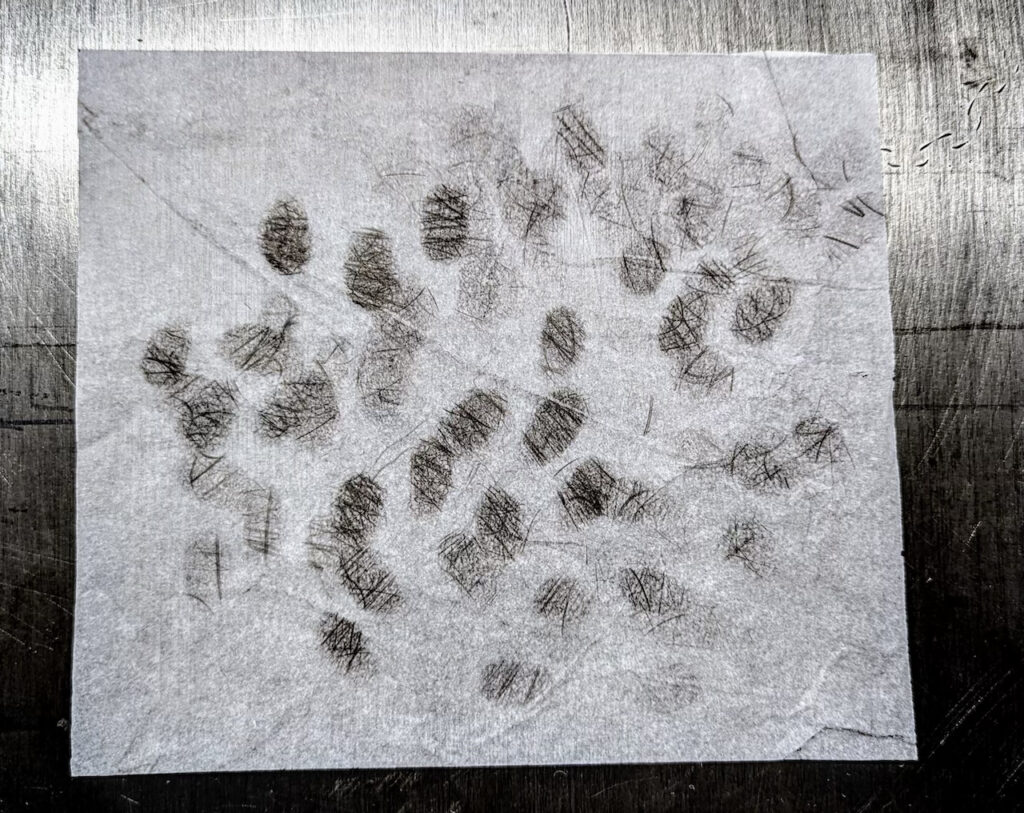 5) Printing the image. Ink is applied to the plate as for an engraving plate or dry-point plate, paper placed over it and then it is pulled through a traditional roller printing press, transferring the ink to the paper, making a final print.