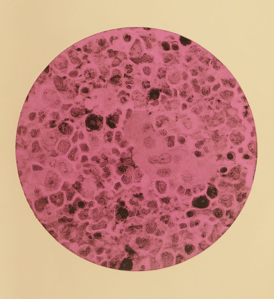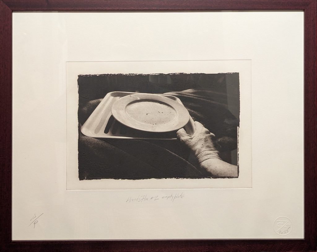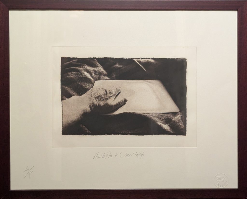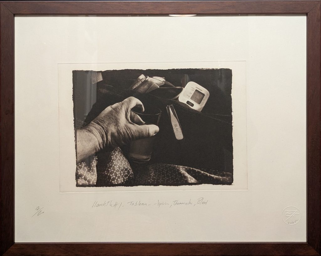 Not so long into retirement, I received a diagnosis of Chronic Myeloid Leukaemia  and I have made a ‘deceptively beautiful’ series that celebrates this change in life. Recently I suffered a bout of flu. The prints in this exhibition are the result of photographing my left hand with a camera in my right while recovering in bed. The prints are made through a photopolymer direct-to-plate process with exposed plates developed in water and dried in the sun before being inked, with black warmed ink, by my right hand.