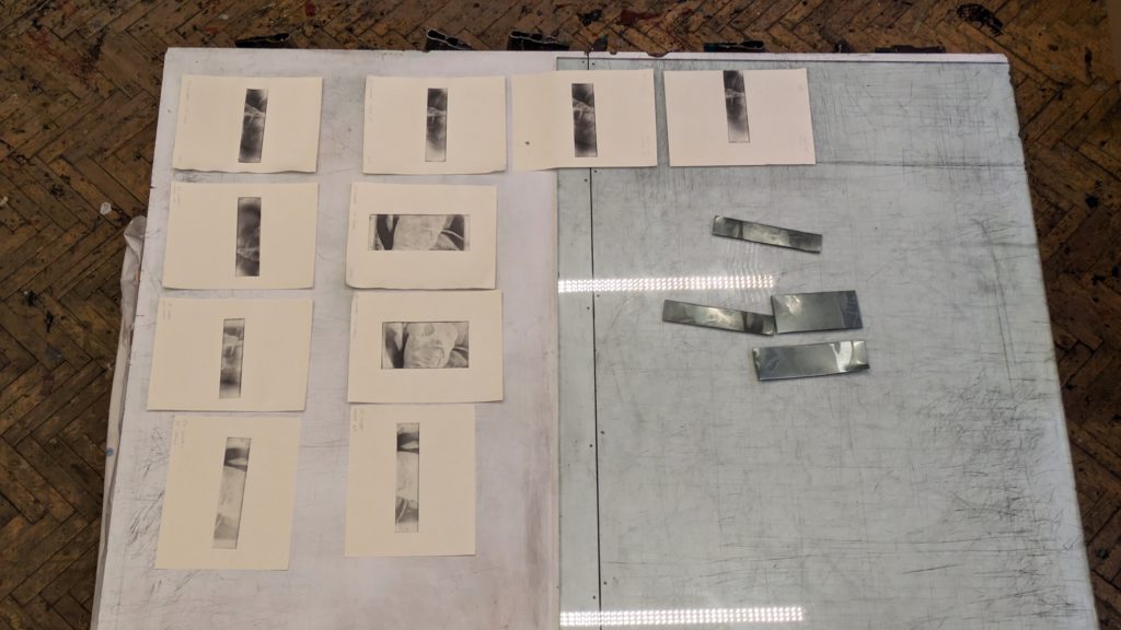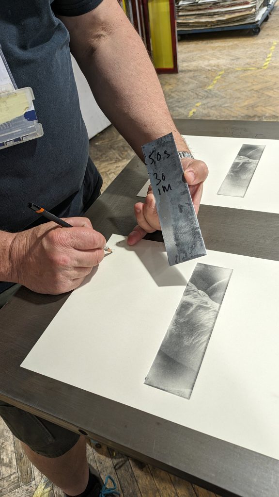 I made film positive of the hand photograph to expose in the dtp method I had used. Unfortunately the large epson digital printer that had been successfully tested to take the very thin metal sheet coated with a light sensitive polymer, was out of commission. I consulted with master printmaker Justin Sanders whether a photo gravure print could be applied to the image. He thought it possible, but it maybe too contrasty. As we could not use the direct to plate method the only way forward would be to make some manual tests to establish an exposure that would provide the breadth of tone. The direct to plate methods had required testing to provide a predictable and stable exposure. Now we would have to test the positive image and the random aquatint screen that together generate the detailed polymer exposure.