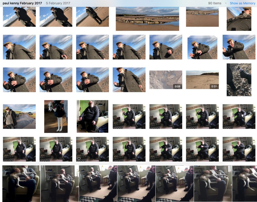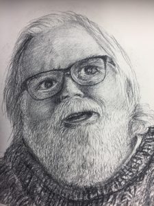 Having introduced and tested the fine mesh and emulsion tests with ‘Katie B and Cousin’ and ‘Sharing Print Insights, Elaine Shemilt’ I returned to Paul and two more drawings printed with the new found and tested fine detail materials. Both portraits are drawn on mark resist with graphite pencil. Drawing two more portraits of Paul also gave the opportunity to test the concept that three might be better than one, to reflect the wealth and warmth of Paul’s character. I had smart phone photographed Paul on a number of occasions and putting all the images together as if on a photographic contact strip allowed me to see how a number of images could be selected to give a fuller picture of the man, rather than a single image.